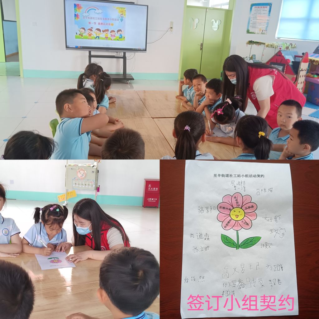 本次活动是安全教育小组活动的第一节“我想认识你”。活动伊始,社工向组员介绍了开展此次安全教育小组活动的目的及意义,随后通过“你的名字”和破冰游戏“桃花朵朵开”引导组员进行自我介绍,活跃现场气氛,增进社工和组员之间的感情。破冰游戏结束后,社工邀请组员分享日常生活中有哪些需要注意的安全事项,“不能用湿的手碰插头、不能要陌生人的东西,不能去小河边......”就这样你一言我一语,在轻松愉快的氛围中,组员彼此逐渐熟悉。最后,社工与组员一起制订小组活动契约,组员纷纷签下契约并表示在以后的活动中互相监督严格遵守小组契约。
