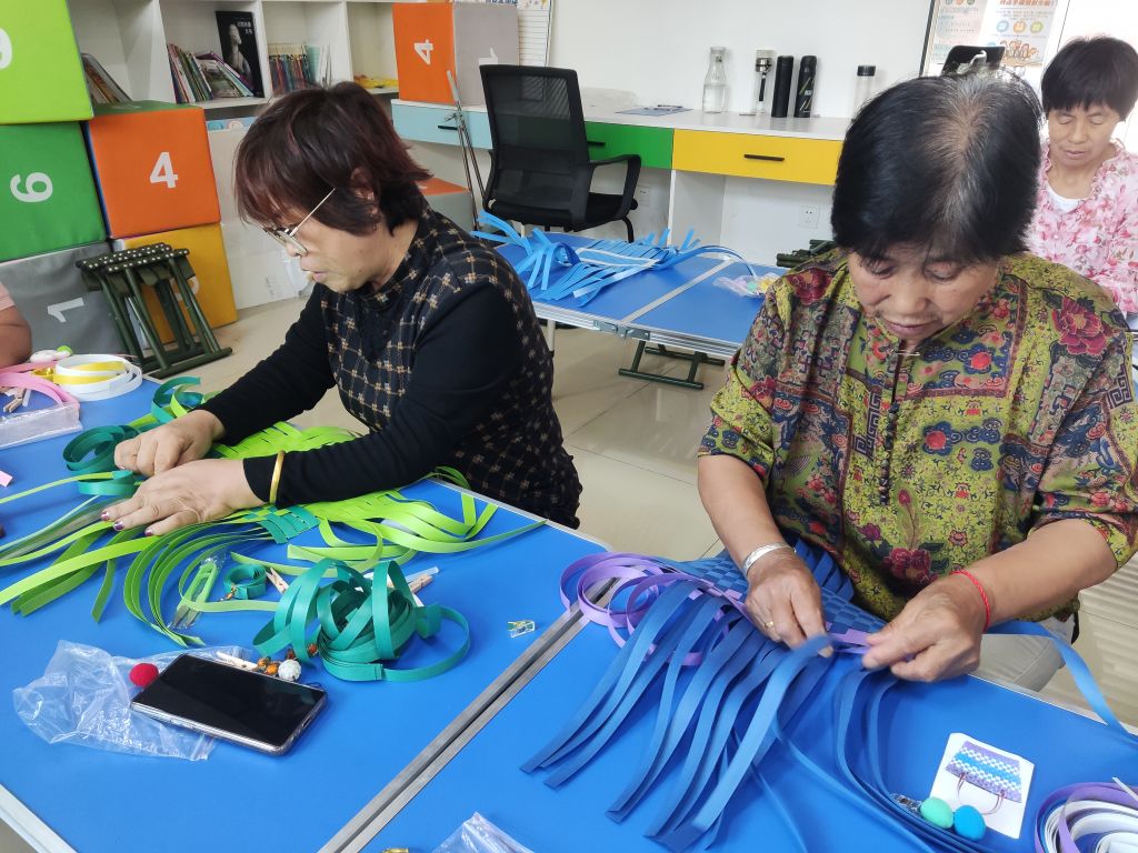 活动现场,大家其乐融融,在社工耐心的引导与教学下,许多起初对自己信心略有不足的服务对象勇敢迈出编织第一步,复杂的步骤在社工耐心的讲解下逐渐明晰,鲜艳的编织条带在大家认真的制作下渐渐成型。在编织过程中,社工以“拉家常”的方式,拉近与服务对象的距离,在陪伴中挖掘服务对象潜能,鼓励服务对象正视晚年角色,引导服务对象建立积极、健康的老年价值观。