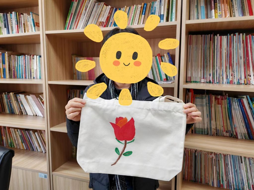 活动中李爷爷拿着笔迟迟不下手,社工察觉询问后,李爷爷回答说:“画不好这个包不就浪费了,我之前是画图纸的。”社工明白李爷爷的顾虑,并迅速给予李爷爷鼓励,以提升他的自信心。尽管他们均为身体残障者,但他们的想象力是无边无际的,他们对于周围的环境,有着独特的看法和情感。最后,他们中的一些人开始根据自己的创意进行创作,而另一些人则根据预先准备好的图案进行模仿和上色。他们使用绘图笔绘制图案的边缘,并用丙烯颜料混合不同深浅的手绘配色,然后上色。这些五彩斑斓的色彩在帆布包上绽放,最终形成了一幅背靠在身上的装饰画,一只只具有独特风格的帆布包便制作完成了。活动结束后,师阿姨讲道:“真的挺不错的,我以后出门就背着它,这可是独一份啊!”