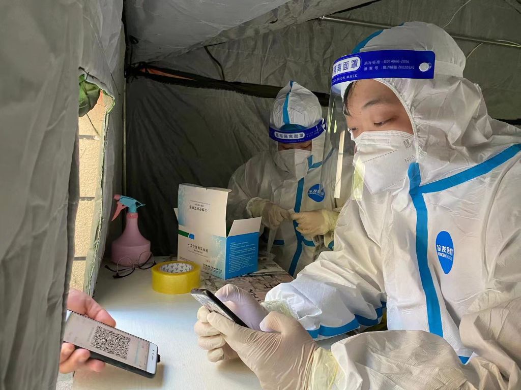 另一方面,社工还为封控单元的居民提供上门入户核酸采样服务,从34层开始挨家挨户敲门扫码登记信息,开展核酸采样工作。在入户核酸检测时,我们做到不漏一人,保证信息完全正确,对居民提出来的问题耐心解答,对有情绪的居民耐心疏导。在这期间也得到了居民的支持与认可:“谢谢你们,你们辛苦了”“天冷了一定要多穿点衣服”“这么晚了你们还没吃饭来我们家吃点吧”等等一系列温暖的话语缓解了我们的疲惫。