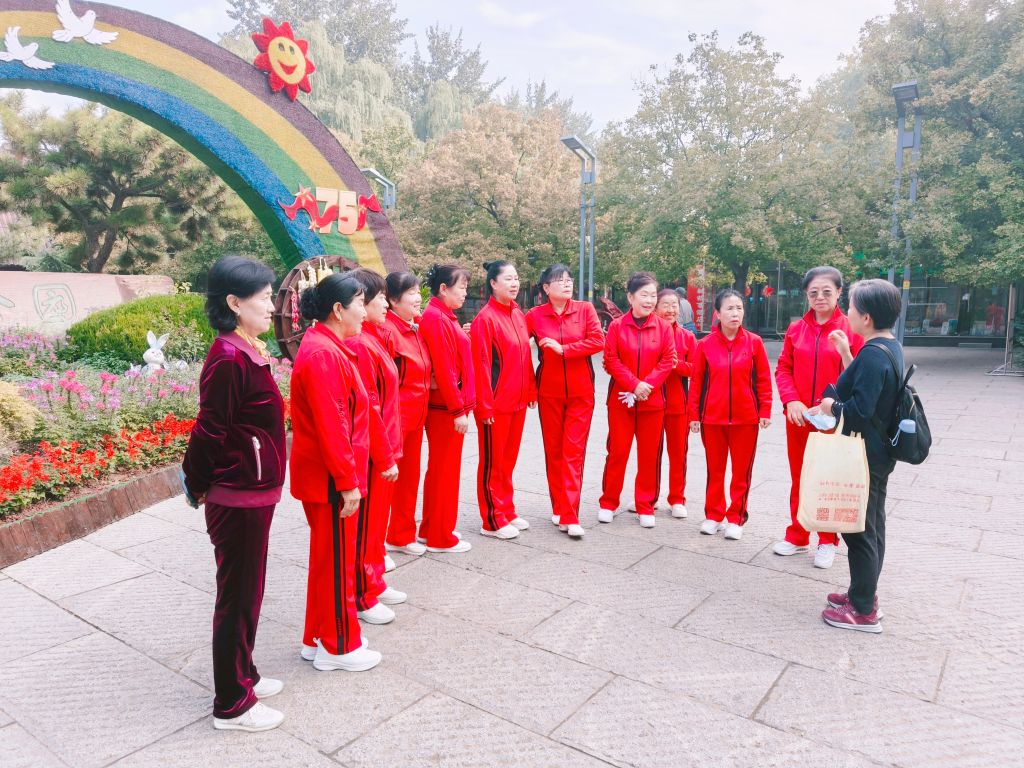 接着,陈桂荣带领艺术团成员发挥团队特长,在公园广场表演了彩带舞、健身球舞、健身操等运动保健项目,柔美的彩带在她们手中如彩虹般绚烂起舞,灵动的健身球在她们的牵引中划出优美的弧线,节奏轻快的健身操唤醒着身体的轻盈与律动。市民朋友纷纷驻足观看,有的称赞拍照,有的询问如何参与,有的在旁边不由自主地跟随舞动。艺术团以实际行动影响着市民朋友关注身体健康,积极参与运动保健。