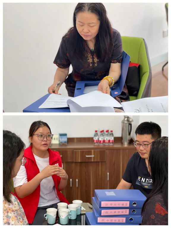在社工的引导下,王玉香院长实地查看唐冶街道社工站的建设情况,对社工站的场所设施、制度建设、服务开展等情况进行详细了解,随后参观社工站协助开展的华夏山青社区暑假托管课堂活动项目,高度肯定了社工站在服务领域开展的工作成效。实地参观结束后,王玉香同社工站工作人员在个案工作室进行社工站服务项目研讨并现场查看档案资料,对需要改进的地方做出详细工作指导并提出相应的工作建议。同时,王玉香院长向社工强调,一定要做好街道调研,认清目前本地的实际情况,以实际需求出发进行社工站服务架构设计。