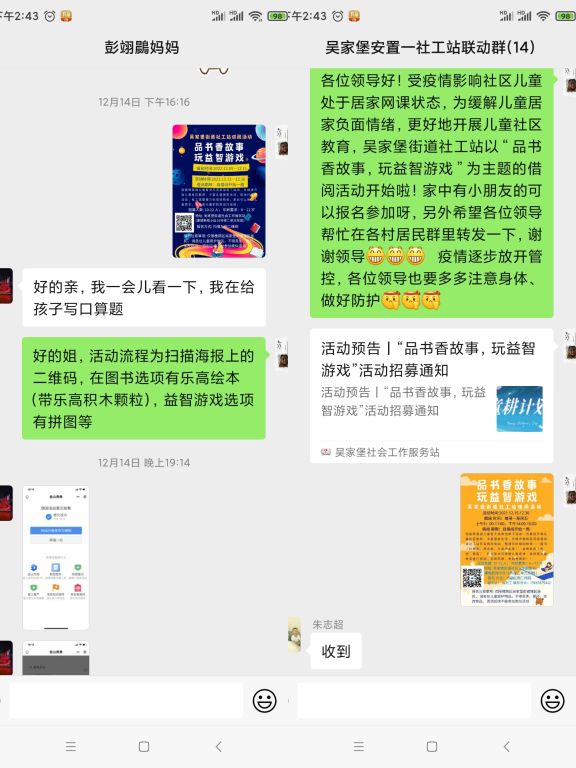基于疫情逐渐放开管控,不少地区儿童仍处于居家网课状态,为持续开展儿童社区教育,丰富儿童居家生活,济南市槐荫区吴家堡街道社会工作服务站(以下简称:吴家堡街道社工站)在济南市槐荫区民政局及街道办事处的大力支持下,通过链接多方社会资源,面向落地社区职工家庭、隔代教育家庭、外来务工家庭、特殊困境家庭子女开展了以“品书香故事,玩益智游戏”为主题的物品借阅活动,旨在丰富社区公共教育供给。