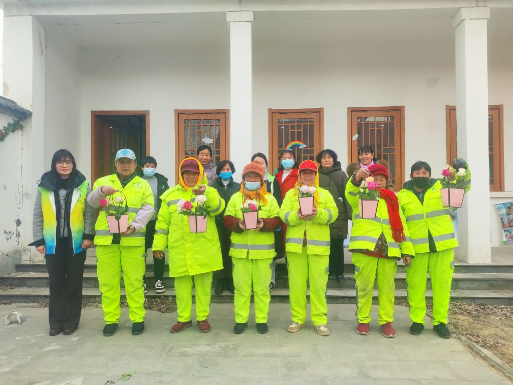 春风十里,煜煜芳华。随着春天脚步的悄然来临,国际三八妇女节也将如期而至。在默默无闻的角落,有这样一群人,她们不论白昼,不畏艰辛,每天用她们的双手默默无闻地为我们的城市梳妆打扮,被誉为“城市的美容师”。在庆祝国际劳动妇女节的同时,不妨把目光投向这些一直默默奉献着的环卫工人们身上,以庆祝三八节为契机,来表达对她们的尊重与敬意。3月8日,孙耿街道社工站组织社区女性志愿者们举办了一场特殊的活动,以插花、献花的方式向环卫工人们致以诚挚的敬意,让她们度过一个温暖的节日。