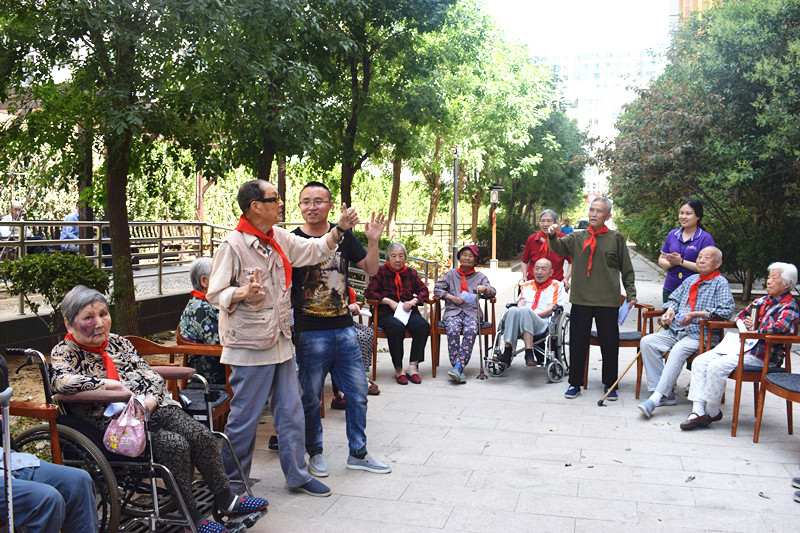 红艳艳的红领巾被社工带到老人面前时,许多老人眼前一亮,社工与中心的工作人员共同为老人们系上红领巾,鲜红的红领巾映着老人们灿烂的笑容,使得明媚的阳光都黯淡了几分。一位老人在系上红领巾后向社工敬了一个少先队礼,开心的说:“没想到我时隔七十多年,又戴上了红领巾!”接着,多才多艺的老人踊跃出列,戏曲、老歌、朗诵精彩纷呈,嘹亮的歌声、活泼的节日、鲜艳的红领巾、可爱的老人们共同构成了院里最美好的风景。