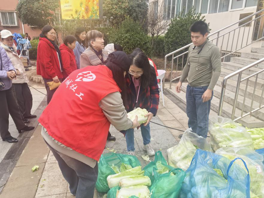 活动现场,在社工及社区工作人员的引导下,居民们整齐地排好队,有序领取白菜。领到白菜的居民个个满心欢喜,脸上洋溢着幸福的笑容,纷纷表示这样的活动既实惠又贴心,让他们感受到了社区的温暖。同时社工还不忘提醒前来领取蔬菜的居民们合理膳食、适当运动、科学规律作息、保障身体健康。除了为老年人提供蔬菜,社工站还特别关注行动不便、生活困难的居民。走访过程中,社工与社区工作人员亲手把白菜递到困难群众手中。每到一处,都会耐心询问居民的身体状况和日常起居等情况,叮嘱其有关因天气防寒家中用电、用气等安全事项。