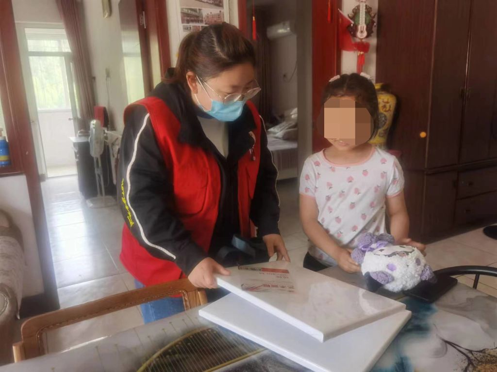 花儿的成长需要一个过程,它需要雨的洗礼,风的抚摸,阳光给予的温暖,困境儿童则是需要更多的阳光来呵护的花朵儿。5月18日下午,王官庄社工站走进困境儿童家庭入户探访送去温暖。在前期入户了解到女孩今年八岁了,是一个学习成绩优异、性格开朗、善良懂事、喜欢画画的孩子。本次探访之前王官庄社工站的社工们特地准备了画板和毛绒玩具作为礼物。