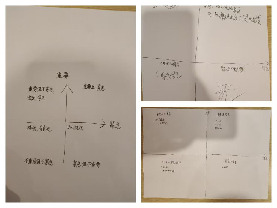 紧接着的独自练习环节,将活动推向高潮。孩子们每人拿到一份事务清单,包括作业、兴趣班学习、朋友邀约玩耍、整理房间等常见事项,他们需独立运用四象限法则,将这些事务分类,并制定相应的时间管理计划。在练习过程中,社工穿梭其中,耐心观察每个孩子的操作,适时给予指导和鼓励。有的孩子将即将到期的作业归为 “重要且紧急”,计划优先完成;有的孩子把长期的阅读计划列入 “重要不紧急”,打算每天安排固定时间逐步推进。孩子们专注思考、认真规划的模样,展现出对新知识的积极吸收与实践运用。
