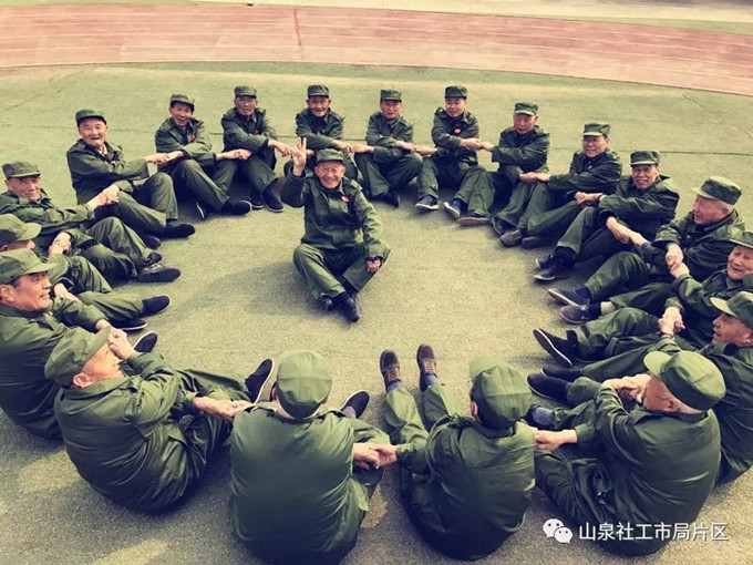 3月17日,天朗气清,惠风和畅。社工带领优抚对象到医院操场,绿油油的草坪在阳光的照耀下,格外养眼。社工与优抚对象一起拍摄了三组“校园风”造型,第一组是“匆匆那年”,借助操场外围铁栅栏,优抚对象排成一排摆出酷酷的造型,模仿大学生毕业照一样;第二组是“老兵检阅式”,优抚对象在主席台前接受领导检阅,找回军人的潇洒气质;第三组是“重返20岁”,优抚对象席地而坐成圆形,彼此拉手或搭建,做出时尚造型。