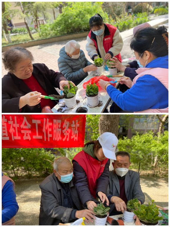 发祥巷社区照护者中老年人比重较高,随着社工站老年照护者喘息小组的建立,老年照顾者有了参与社区、融入社区、搭建互助平台的途径。老年照护者因为对智能手机、网络等社交途径的欠缺,社会支持网络相对较弱,又因长期照护自己的亲属,导致多数老年照护者压力较大、生活单调。为缓解照护者的照护压力、加强小组成员间的沟通交流,五里沟街道社工站邀请小组成员在发祥巷小区的树荫下一起进行盆栽种植。