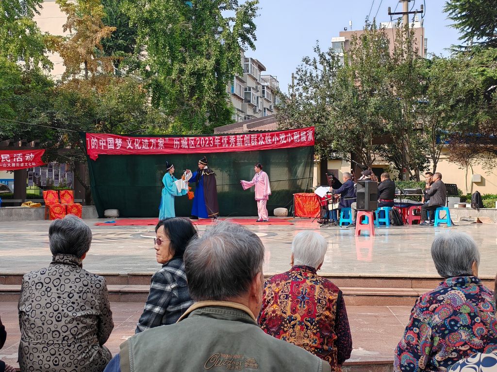 社工提前来到活动场地,协助演出人员准备演出道具,随着紧锣密鼓的锣鼓声,戏曲演出拉开了序幕,在利农花园小广场上,聚满了来自四面八方的居民群众,演出团送来了戏曲《鞭打芦花》,讲述了老百姓家喻户晓的,耳熟能详的节目。舞台上,激昂动人的鼓板、演员们清脆悦耳的唱腔和惟妙惟肖的表演,以及扣人心弦的剧情,让人群中不时爆发出热烈的掌声。大家三五成群,或站或坐,看着表演,听着戏曲,赞不绝口,时不时拿出手机记录下精彩瞬间,场上场下气氛热烈,让群众近距离地感受到了戏剧的魅力。