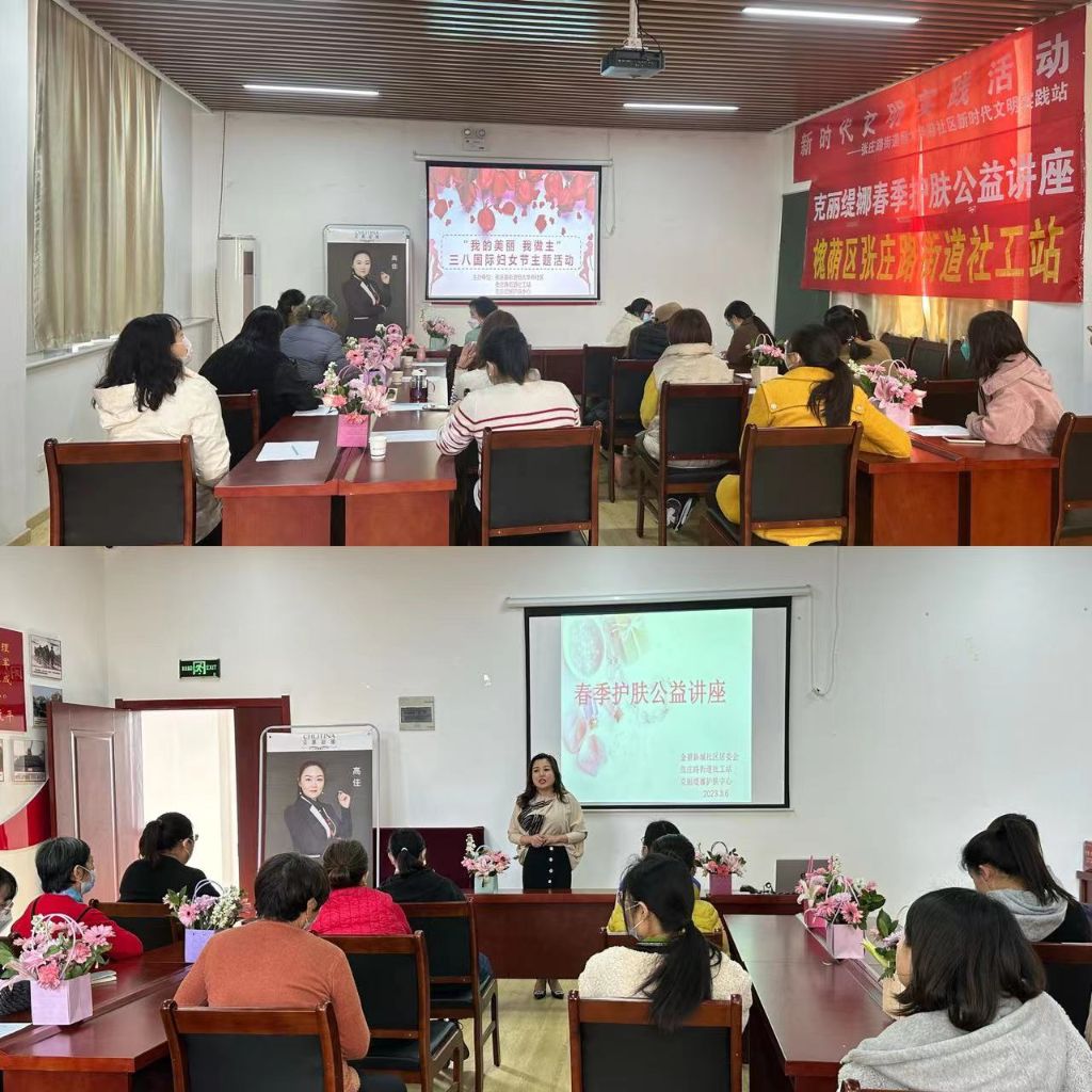 为了让社区女性懂得更多装扮自我、美丽自我的技巧,营造社区女性的良性发展状态,为社区女性赋能,3月6日,张庄路街道社工站联合恒大华府社区居委会,金碧新城社区居委会特举办“春风十里,绽放自我”春季护肤公益讲座,辖区内克丽缇娜护肤邀请克丽缇娜专业讲师为社区女性科普护肤美妆知识以及相关技巧。此次活动服务社区女性40余人。