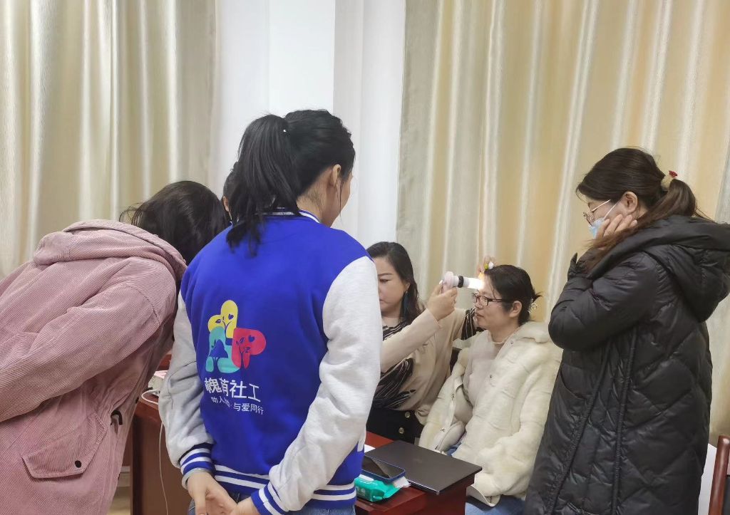 社工配合老师为社区居民测肤