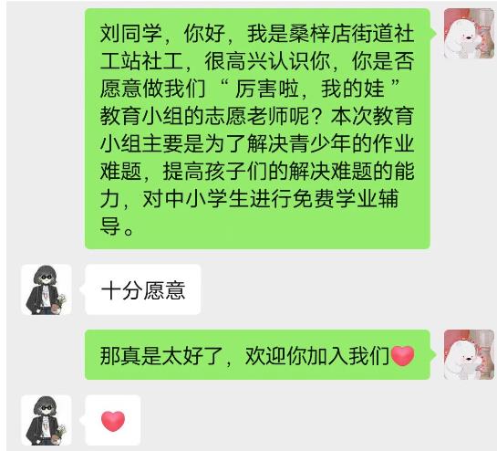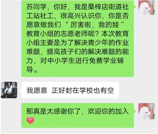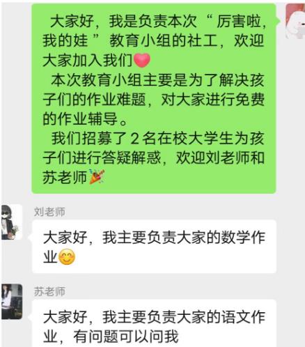 时下,受疫情的影响,辖区内中小学都纷纷的使用网络授课的模式,来深入落实“停课不停学”的教学方案。为解决青少年的作业难题,提高孩子们的解决难题的能力,桑梓店街道社工开展了“厉害啦,我的娃”线上作业辅导教育小组,筛选招募了2名大学生志愿者对5名中小学生进行免费学业辅导。