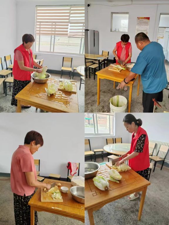 志愿者们早早领取白菜、豆腐、肉等食材,来到夏庄幸福院。大家分工合作,有的清洗白菜、有的清洗刀具、有的切肉、有的掌勺。忙而有序,认真细致的为老年人做出味道可口、荤素搭配的饭菜。