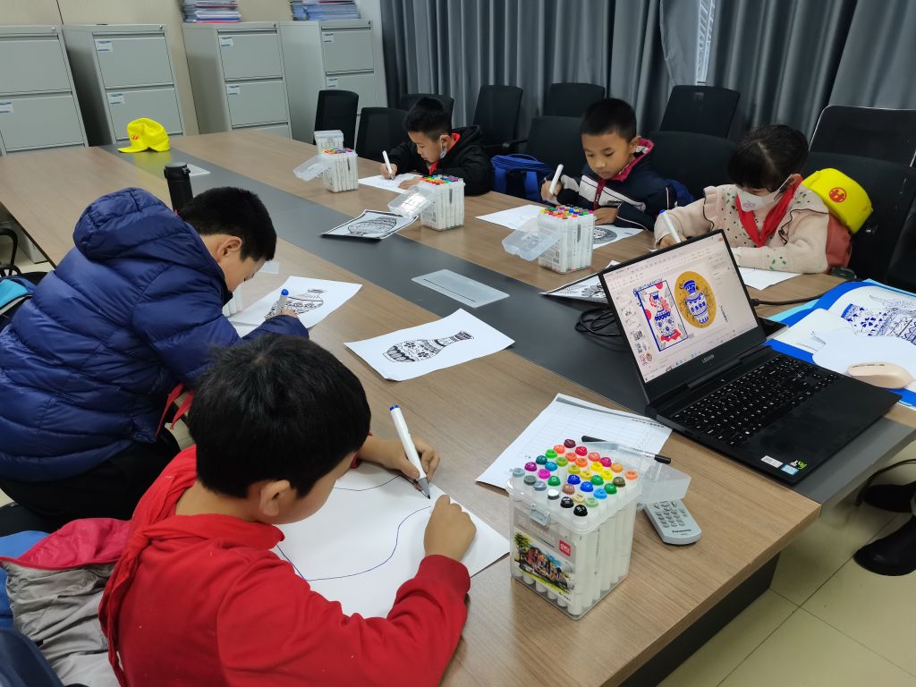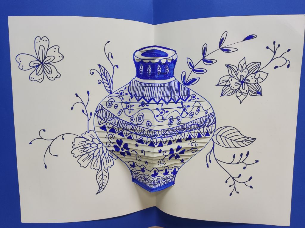 随后,社工为大家放映立体纸艺相关的作品和视频,介绍其制作步骤,结合点线面,利用蓝黑白色、给人清幽高雅的视觉享受。让孩子们仔细观察青花瓷的特点、结构、器形、以及纹饰,感受青花瓷的非遗文化-立体纸艺之美,并与孩子们一起展开创作。在绘画中,孩子们生动地抓住了青花瓷的特点,大家通过设计、剪刻、折叠、卷曲、塑形、粘贴等技法,将传统的平面剪纸进行立体化,让青花瓷在平平无奇的纸面上变的直观而有趣味,制作出自己独一无二的纸艺立体青花瓷。