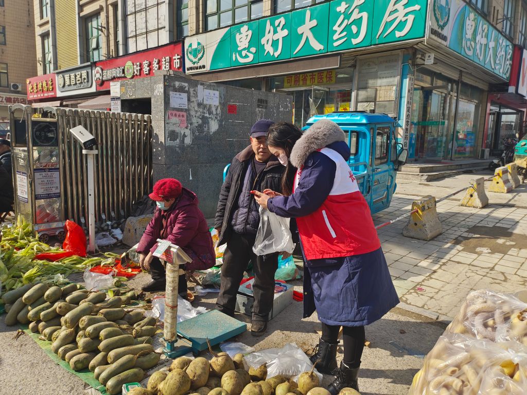 活动当天,社工早早来到了乐天大集,帮助农户摆放农产品,确保摊位整齐,便于消费者选购,然后统一进行人员分工——招揽、称重、搬运、收款等等,使活动井井有条地进行。在社工一声声的叫卖中,吸引了许多居民驻足选购,同时社工向过往的居民介绍水萝卜的品种及优点,帮助边大爷宣传。活动现场氛围一时热火朝天,品质优良的水萝卜也得到了居民的一致好评。