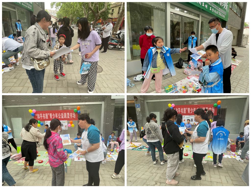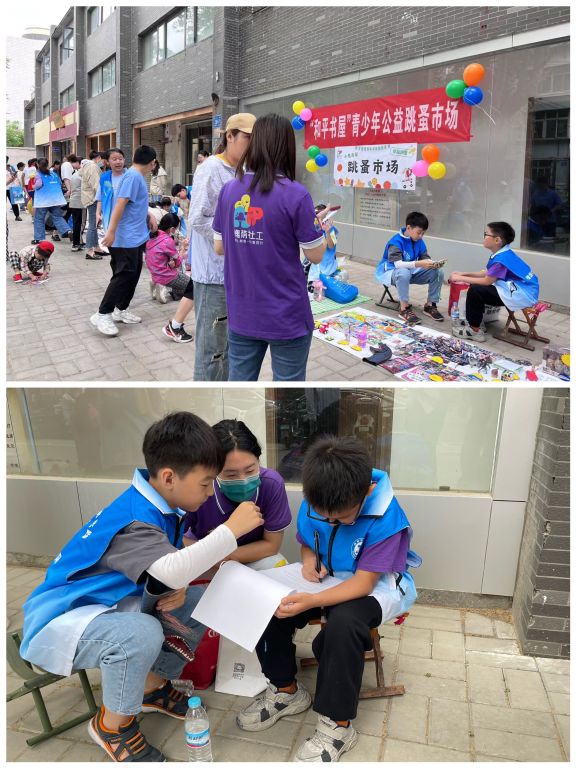 公益市集上,社工站链接和平书屋的“益书志愿服务队”在公益市集上进行宣传和服务。通过志愿者们身体力行地协助现场青少年儿童“以物换物”、现场拍照、维持秩序等,让辖区青少年儿童对“志愿服务”有了概念和兴趣。同时志愿者现场以分发宣传海报的形式对“和平书屋”及“益书志愿服务队”进行宣传,让志愿服务意识在辖区青少年及儿童的心底埋下了小小的种子。