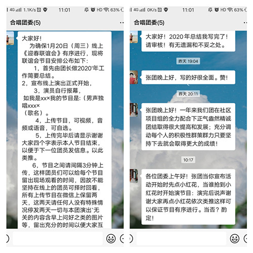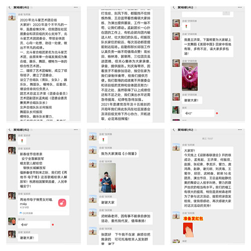 线上协商,明确细节。在线下日常活动暂停后,针对北斗星艺术团的年终总结,社工与队伍骨干一起进行了线上讨论。首先,以队伍的年度发展为切入点,就队伍的团队结构等情况进行了梳理;接着,基于近期社区疫情防控的线下活动要求,以线上迎春演出为切入点,团队提出了自己对于节目征集、节目发送规则等具体策划,大家交流了彼此的想法,也明确了相关分工。