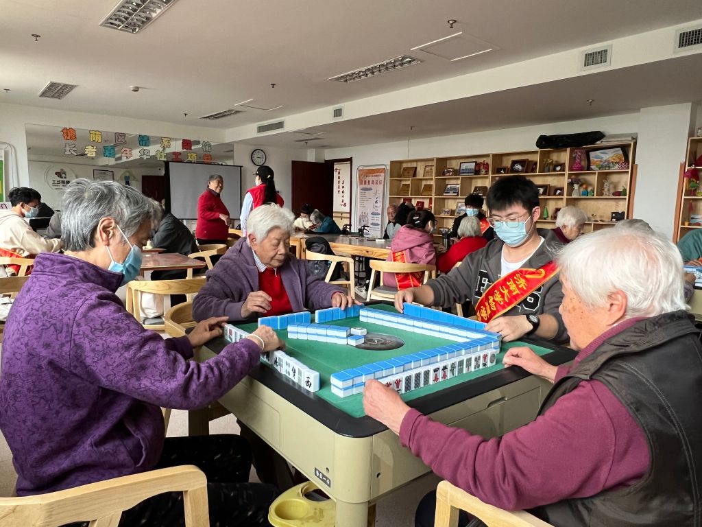 大学生志愿者们深入福利中心,通过陪住养老人下棋打牌,教住养老人使用智能手机,听老人唱歌、讲述往事等形式,提高住养老人在社会集体中的归属感,使得他们感受到来自社会的关爱与温暖。