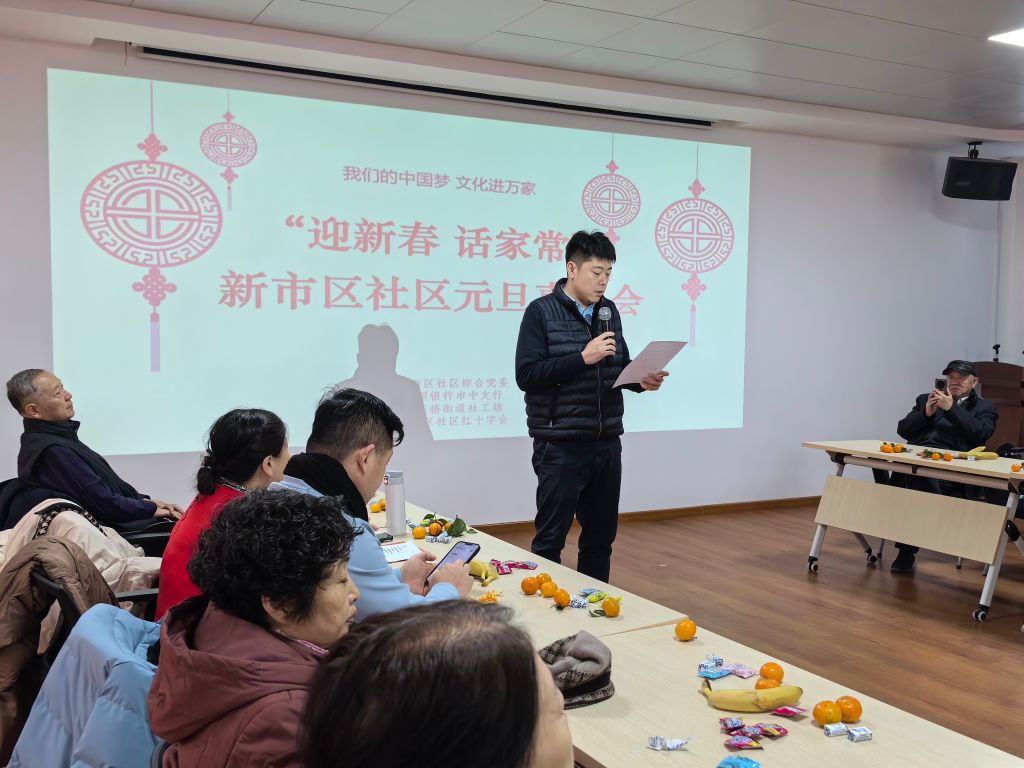 活动伊始,新市区社区书记宋嘉纬代表全体工作人员,为大家送上了美好的节日祝福,对过去一年的社区工作进行了总结,充分肯定了辖区共建单位和居民朋友对社区工作的支持和付出,期待大家在新的一年里,携手并进,凝聚力量,团结一心,继续打造更加平安、幸福、和谐的社区环境。