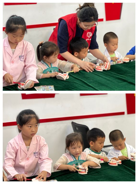 小朋友们在“我是小牙医”职业体验环节,争相上台为现场家长朋友们教授护牙知识,演示正确刷牙方式,学的有模有样。