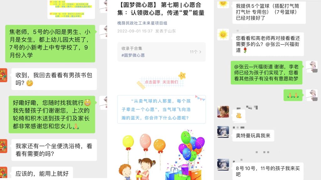 “一个篮球,一套绘画用品,一个喜欢了很久的星黛露书包,一个奥特曼的玩具......”困境儿童的心愿是如此简单而童真。为切实关爱困境儿童,用行动传递温暖,槐荫区未保中心持续开展第七期“圆梦微心愿”的心愿认领活动。儿童社工联动街道儿童督导员、各村(居)儿童主任积极向辖区社会散居孤儿、事实无人抚养儿童、重点困境儿童等困境儿童收集心愿,随后将心愿清单发布于各大媒体平台,并联动基层儿童福利队伍广泛宣传,转发至微信群内和朋友圈等,多方式多渠道助力困境儿童心愿达成。心愿清单一经发出便收到来自社会各界爱心人士的积极响应,详细了解困境儿童的心愿需求,并积极表示自己愿意作为儿童们的圆梦人,为儿童实现心愿,照亮他们前行的路。