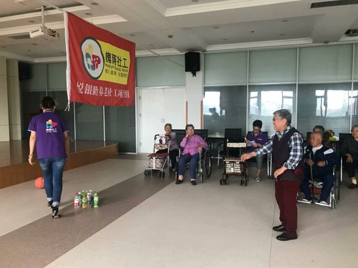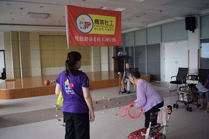 社工提前了解老人们日常的生活需求及喜好,为老人们采购日常所需物品作为活动奖品,既满足了住养老人的需求,也提高了老人们参与活动的积极性、主动性。活动开始,邀请梁奶奶简洁明了的讲解了一下活动规则,梁奶奶话音刚落老人们就络绎不绝的起身准备。第一项活动是保龄球,老人先是依次按顺序排好队,并开始了一系列的投球,嘴里还不时念叨着 “中!中!中”。第二项活动为水上乒乓球,社工协助老人把球弹到对面装有水的盆里。社工和老人完美的配合让这项活动增添了不少乐趣。最后一项则是老人们最喜爱的套圈大比拼,过程中有经验的老人向大家传授自己的经验,帮助她们获得奖品,体现出老人互助的精神。
