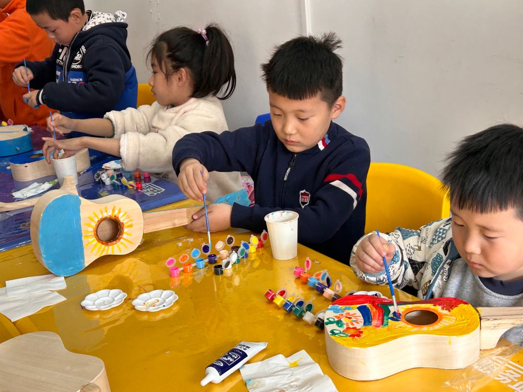 在社工的引导下,孩子们大显神通,不一会儿就将琴头、弦钮、琴码、琴枕、指板、琴弦等部件安装到了尤克里里面板上。紧接着就到了快乐涂鸦时刻,孩子们充分发挥自己的创意,用五彩斑斓的颜料在尤克里里表面绘制出各种图案。有的孩子在琴身上画出了可爱的卡通人物,有的则选择绘制美丽的自然景色,还有的发挥抽象思维,创作出了独具特色的图案。在社工的支持和引导下,每一个孩子都用心投入到尤克里里的制作过程中,用双手将自己的想象力和独特个性融入尤克里里中,现场气氛热烈而愉快。