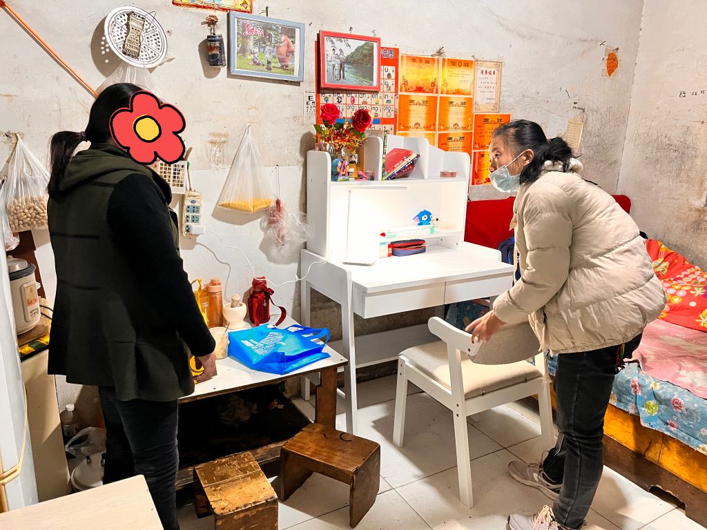 胜胜跟妈妈租住在济南市十六里河街道东河村一间12平方米的农村自建房里,狭窄的空间里,2张床就占据了多半的位置,孩子没有独立的学习书桌,写作业、吃饭共用一张小桌。“我们家地方太窄了,开始怕放不开书桌,都想放弃的,没想到积成社的老师们特意跑来,又是量尺寸,又是给建议,最后还单独给我们定制了小一款的书桌,真是太感动了!”现在,胜胜有了自己的书桌,终于收获了一方属于自己的学习小天地,在家的学习兴趣提高了很多。