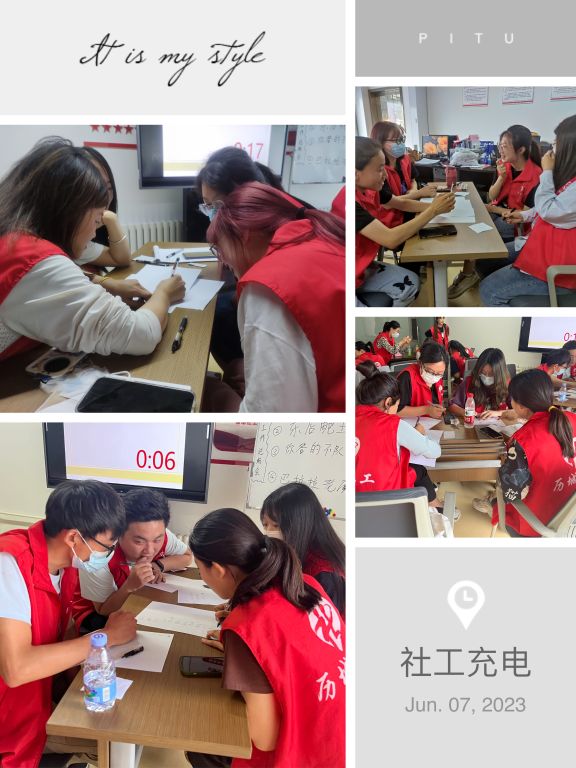趣味知识问答环节,总站以抽到同一首古诗词为一组的分组规则,将在场社工分为4组,并引导每个小组在内部讨论后确定本小组队名,以打破组员之间的陌生感,增进小组凝聚力。随后,总站通过视频的形式向社工们介绍本环节的规则,并向各组发放答题纸笔。随着电视屏幕上的题目跃然而出,社工们立刻进入了“参赛状态”,在有限的时间内展开了激烈的讨论,确定答案后及时派出组员提交。在该环节中,时而社工专业问题,时而趣味脑筋急转弯,社工们集思广益,群策群力,在不知不觉间,对服务流程和专业方法的运用等问题进行了复习巩固,也加深了各站点之间的交流与沟通,现场营造了良好的学习氛围和轻松愉悦的互动气氛。
