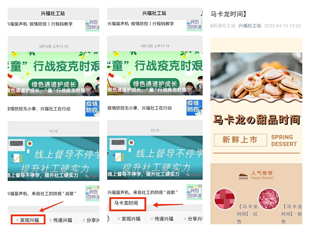 “马卡龙时间”板块承接兴福街道社工站“情绪马卡龙”综合接待区,弥补疫情期间避免线下服务的空缺,并作为延伸活动,设置在兴福社工站公众号消息页面。该板块始发七种有关于色彩心理的独立文章,居民可以根据不同的情感选择不同的颜色,领取属于自己的趣味文章。