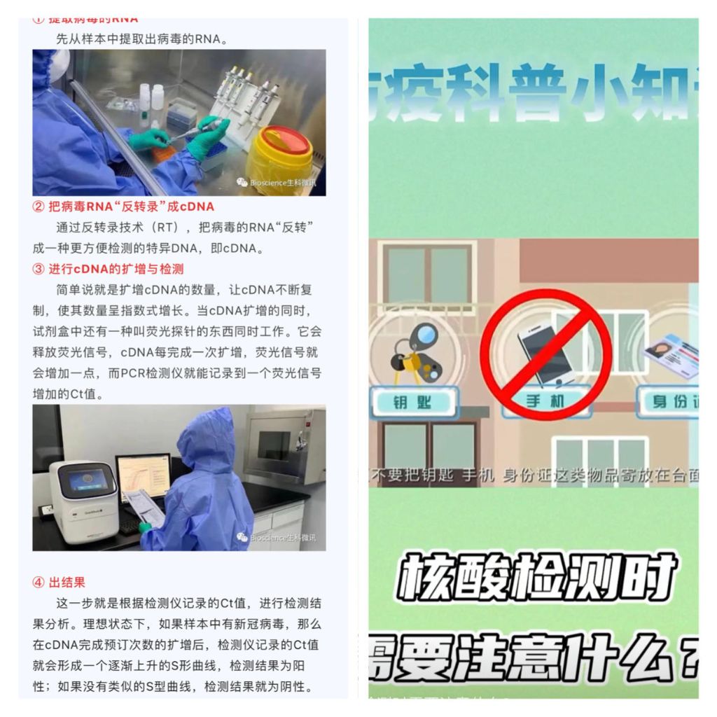 第二:加强科普力度。加大工作人员的科普和对居民的科普宣传。在现场有的叔叔阿姨会问10个人的棉签都装在一个管里真能有用吗?有的对于检测的原理比较好奇,而现场的非医务工作人员并不了解原理,医护人员也没有精力和时间。下一步,可以加强核酸检测原理等相关科普。
