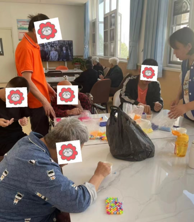 经历前面七期的团结协作,老人与老人之间,老人与社工之间在无形之中建立了亲密的联系,以前都是社工在桌前活跃气氛,与老人之间一问一答,虽说安静祥和,但总缺些小组家庭应有的生气,如今老人们已完全放下了活动最初时的拘谨,在串珠桌前畅谈自若,从单方面的提问逐渐变得活络起来,大家互聊家常,愉悦的笑声让房间里的暮气一扫而空,随着活动的开展,老人的串珠手法也愈加熟练,不用全神贯注也能轻松将串珠相连,老人之间的互动将小组气氛点燃,串珠已经不是众人关注的唯一焦点,交流谈心成了此次活动的重头戏,串珠活动成了点缀,大家坐在一起,一切都是那么的轻松自然。虽然老人们在社工来之前就生活在一起,但由于没有共同话题,生活起居也都由工作人员照顾安排,并没有什么太多的互动,大部分老人们并没有过多的交集,随着“掌心阳光”活动的开展,老人们为了同样的目标努力,有了可以互相学习,理解和帮助的平台,也在社工的引导下逐渐袒露心声,老人之间有了更深程度的了解,如今才算得上真正认识了彼此。