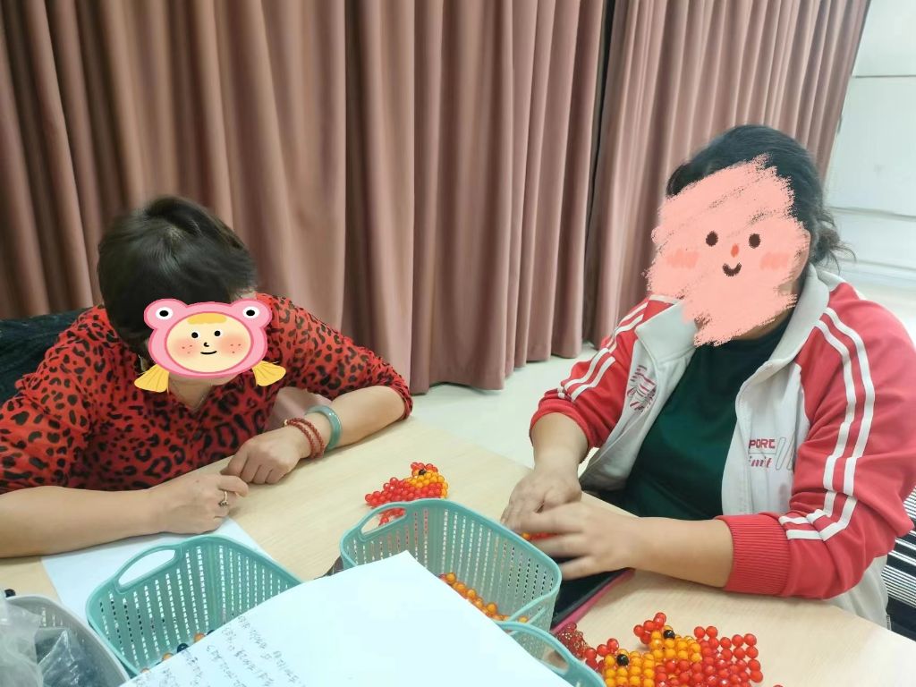 经过前五期小组的开展,组员之间已经建立了紧密、信任的关系,小组结构稳定。在“串珠达人”环节,社工鼓励组长发挥领导者的能力,指导组员之间互相帮助。在交流互动中,大家手中各色的珠子如同被赋予了生命,通过巧妙的搭配和排列,将一颗颗珠子串出了丰富多彩的作品,这些手工艺品不仅具有观赏价值,而且具有一定的实用性。活动现场气氛热烈,大家沉浸在手工艺术的乐趣中。
