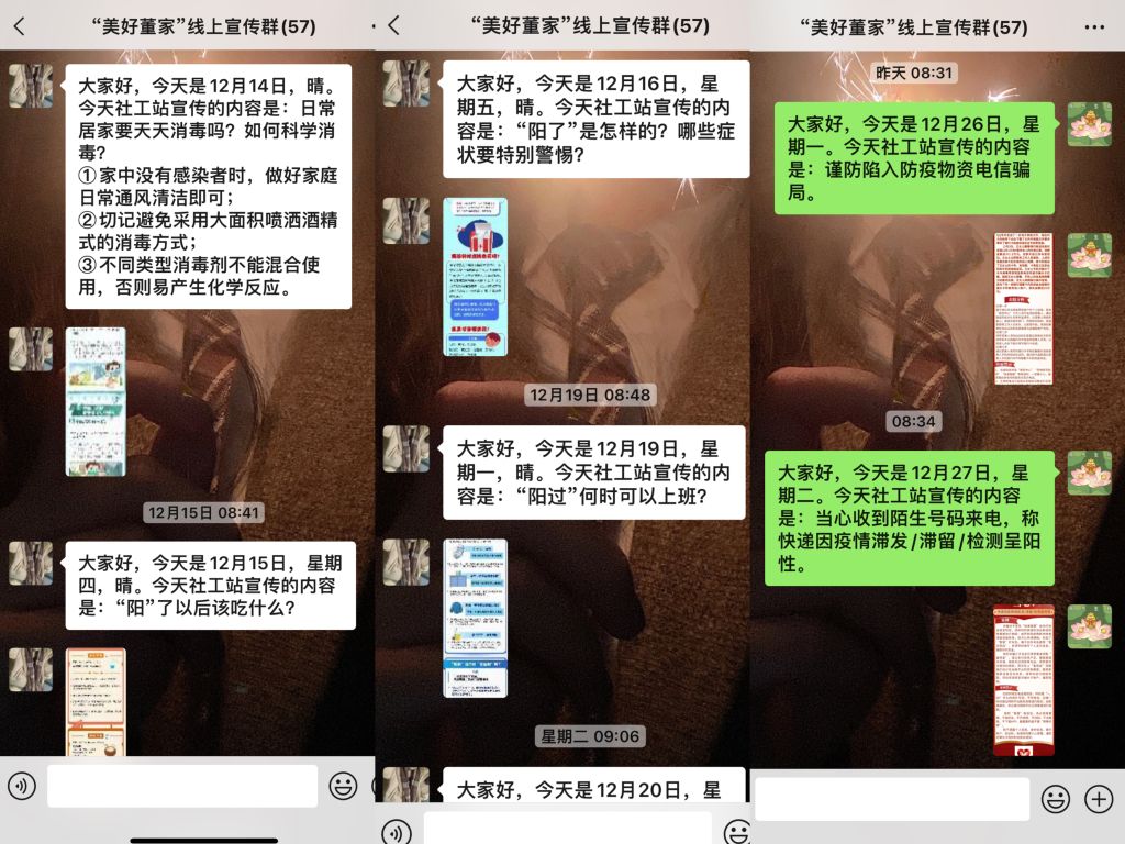 社工不仅对辖区内服务对象及其他特殊群体的家庭健康检测进行追踪,并再通过微信群、微信公众号、电话联系等方式进行逐一摸排并根据实际情况予以救助。社工站在积极响应街道关于疫情防控形式变化下,对各个线上宣传平台积极开展宣传教育工作,及时为辖区内老年人、儿童及特殊群体的居民群众提供现阶段防疫知识及相关政策,协助有需要的居民做好科学的防控预案,帮助他们科学认识疾病并从容应对来势汹汹的奥密克戎病毒。