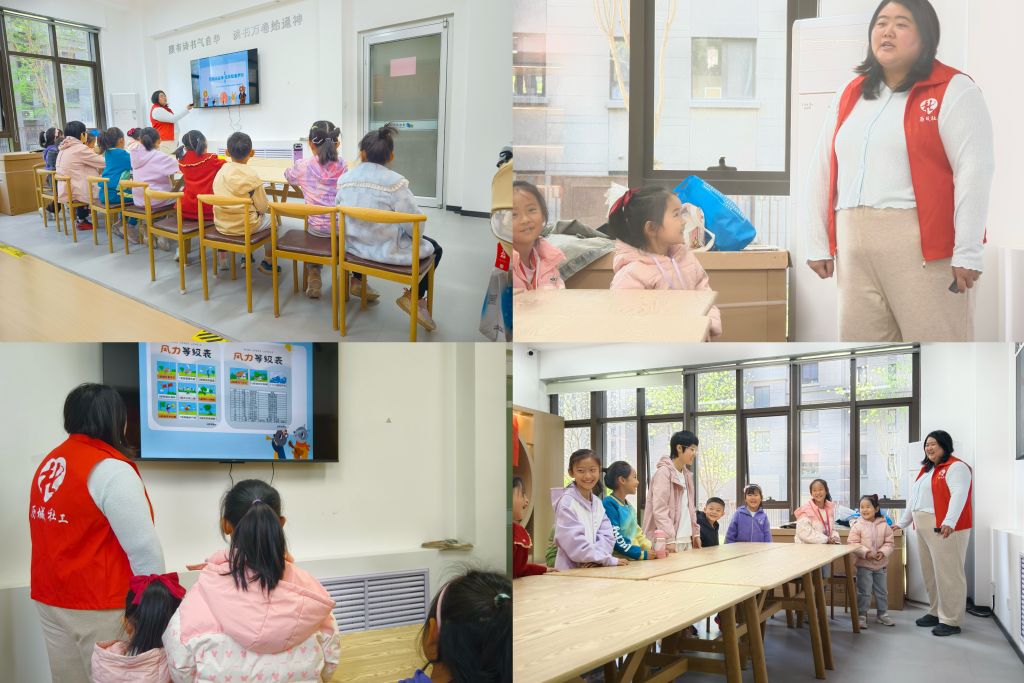 活动伊始,社工设计《情境代入教学法》课程,运用抽象知识具象化的科普方式,以近期大风天气为切入点,用风力等级表引导孩子们描述“被风吹得睁不开眼”“小区里的树苗被吹弯了腰”等生活体验。在共读《风来了》绘本时,社工巧妙设置“风还可以去哪里帮忙”等开放式问题,引导孩子们巩固绘本上的气象知识。