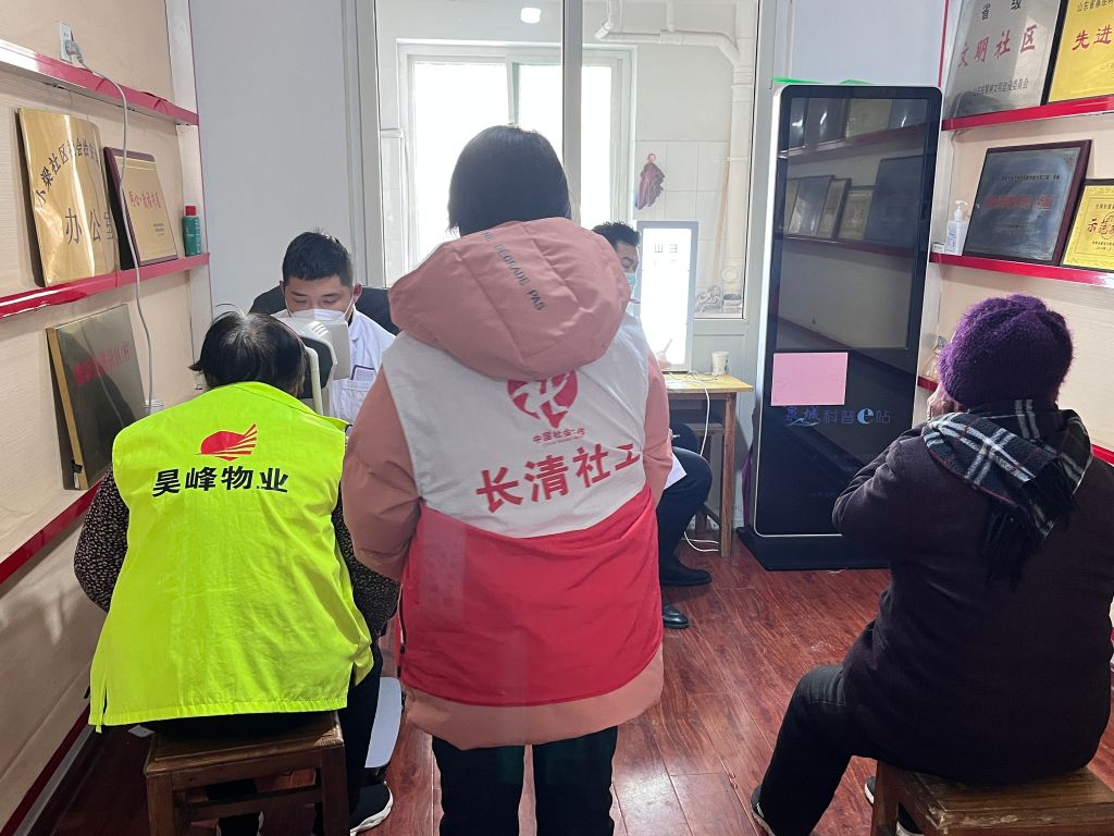 活动当天,志愿者们提前到达现场布置好医疗器材。在义诊环节社工耐心的为前来就诊的居民登记信息,引导居民有序排队。义诊志愿者们分工协作,有序为居民们进行检测问诊。眼科义诊志愿者利用专业检测仪器为辖区居民免费提供视力检查、眼压检查等项目,并根据居民检查结果提出诊疗建议。同时,志愿者也在现场普及眼科保健知识与眼病防护知识,增进辖区居民对于眼部疾病的了解,帮助社区居民养成良好的用眼卫生习惯。在检测过程中志愿者发现很多老人都患有白内障疾病,志愿者向老人们科普国家在2023年出台了白内障手术相关政策。