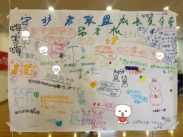 夏令营的美好时光转瞬即逝。短短五天里,“守护者联盟”的营员们从互不相识到成为亲密伙伴,从嬉笑打闹到自律有序,一起订立契约、走访社区、参与社区治理、感受公益行动的魅力。活动最后,社工与营员们一同回顾夏令营中的精彩瞬间,并在留言板中写下自己的感受与心里话,为本次夏令营画上了一个完美的句点。