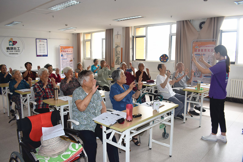 活动还没开始便有几位老人早早来到老年大学等候,社工为提前到达的老人播放音乐,接着便去推喜欢参加活动但行动不便的老人。活动伊始,社工带领老人玩了“数鸡蛋”和“拍西瓜”的游戏,老人们乐的前仰后合,笑声不断。活动中社工以通俗易懂的语言向老人们介绍了天应穴、睛明穴、四白穴与太阳穴的位置,并逐一纠正老人的动作,为方便老人记忆,社工编了一个顺口溜带领老人一起读。时间在欢欢笑笑中流逝的飞快,活动结束后,几位老人留在了老年大学并邀请社工一起玩跳棋。