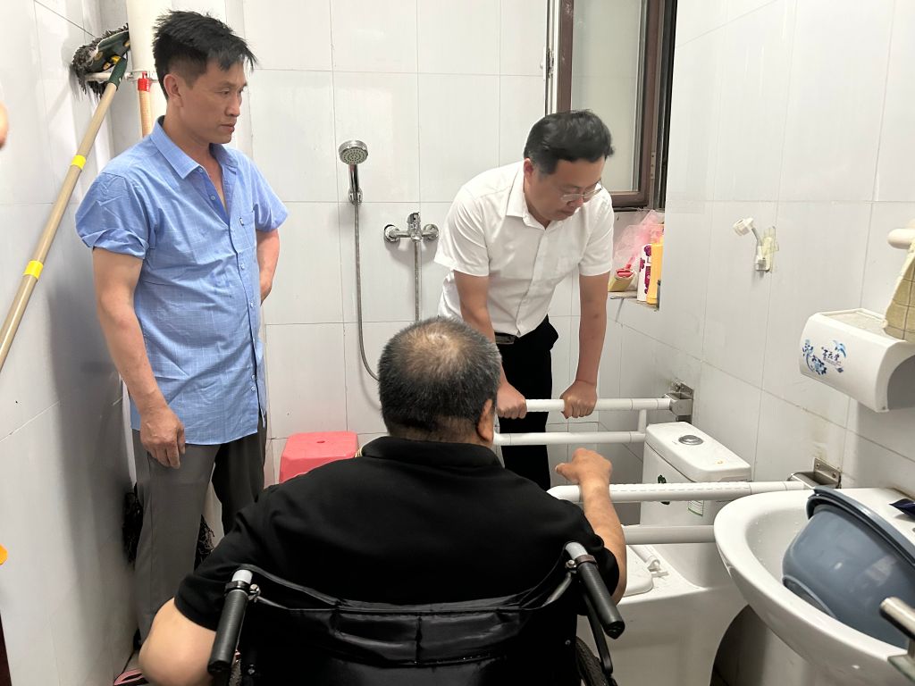 董家街道社工站社工将上次入户了解的信息及照片整理后,便积极与爱心企业联系,社工和企业负责人经过多次沟通后,最终确定了无障碍扶手更换方案。6月13日上午,民政办主任赵而强与社工站、残联工作人员和爱心企业维修人员再次来到谢老师家中,针对谢老师提出的困扰进行查看,对无障碍扶手进行维修。