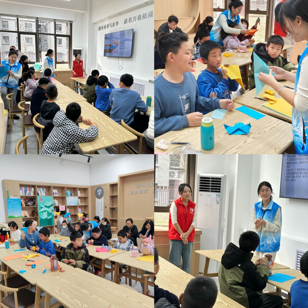 宣讲环节结束后,志愿者们引领孩子们投入到互动体验的小游戏中,展开了“逛三园”和“舜耕历山折纸”的游戏。在逛三园小游戏中,孩子们进行了激烈的速度和反应比拼;在折纸环节中,孩子们积极踊跃地互相分享折叠技巧,有的踮着脚为小伙伴示范“对角折线要对齐”的要领,有的三五成群的讨论如何把“牛角”折得更立体。完成作品后,孩子们高高举起折好的小牛和小象,争着让志愿者帮忙拍照留念。