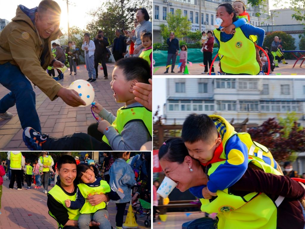 赛场上妈妈的后背是孩子坚强的后盾,在第一场比赛“猪八戒背媳妇”中,哨声一响,每位妈妈都鼓足了劲头,奋力向孩子跑去。给孩子系上红头巾,妈妈们背起各自的“媳妇儿”,孩子笑呵呵趴在妈妈的背上,穿越障碍,冲向终点。在欢声笑语中,活动来到了第二场,四位家长站在拉拉乐四角,你挣我赶,为自己的孩子贴上一个贴画,有的家长不仅拼力气,还拼策略,有的家长则争取外援,比赛的重头戏随着爸爸们使出浑身力气奔向孩子而迎来高潮。最后一场比赛是“螃蟹夹球”,家长和孩子齐心协力将球运到终点。靠在家长的怀里,跟上大人的步伐,孩子们在游戏中体验着与父母的拥抱、加油。在每个环节,家长和儿童都尽情投入,酣畅淋漓,享受着比赛中的亲子时光。