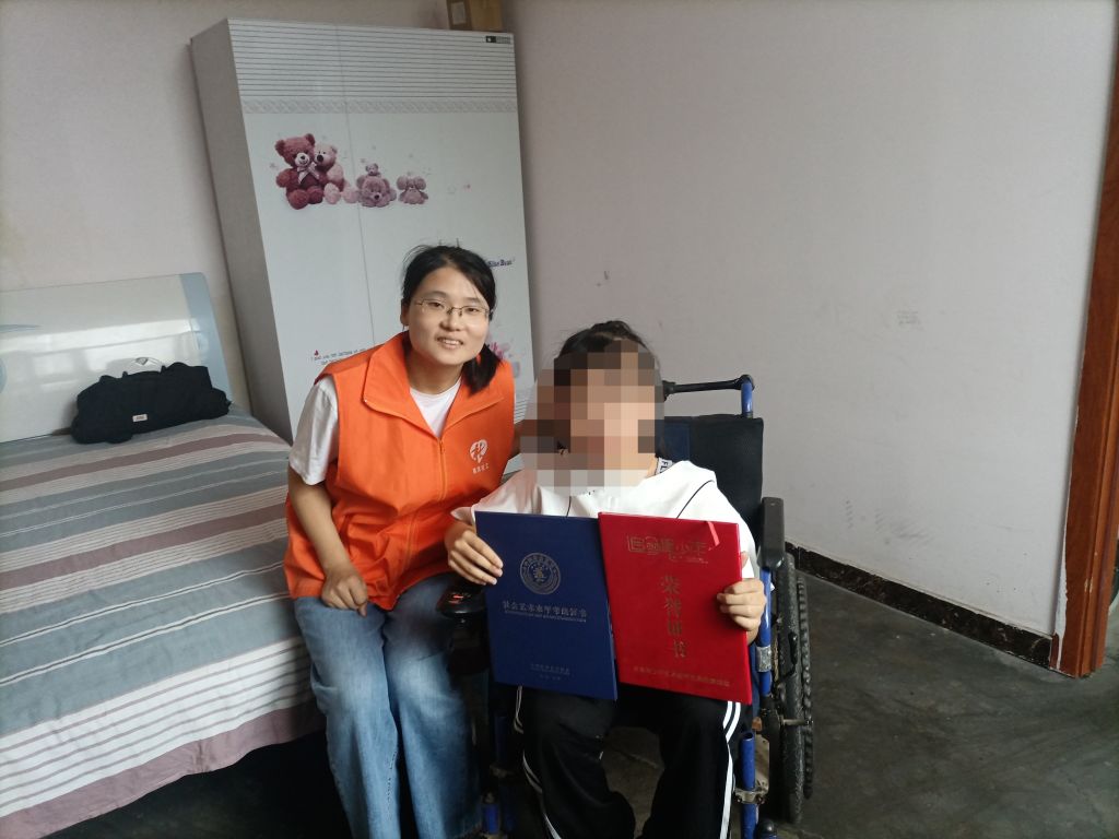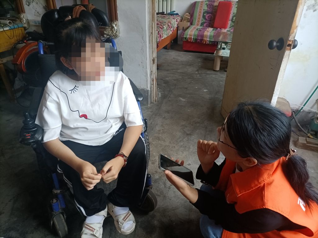 在残疾儿童小涵的家中,社工了解到小涵和母亲两人都是双腿残疾常年坐轮椅,生活十分不便,父亲则在外打工补贴家用。小涵上厕所、吃饭等都需要人照顾,为此她只能在家里上网课。母亲为此非常发愁:“我现在最愁的就是她的学习,我没啥文化,不能让孩子再跟我一样。孩子的成绩之前在学校都是名列前茅的,自从上了五年级以后我也辅导不了了,孩子的成绩下降了很多,现在我很担心!”得知这一情况后,社工小张主动请缨为小涵辅导课业。“你们能帮忙辅导小涵的学习,那真是太好了,太感谢你们了!”小涵的母亲拉着社工小张的手激动地说。临走前,社工还叮嘱小涵要认真学习,努力用知识的力量改变命运,鼓励她要以勇敢乐观的心态面对生活中的一切困难。