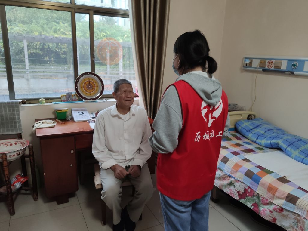 本次活动以老年人需求为导向,以志愿服务的方式为机构养老、空巢、高龄、失独老人提供情感支持、义诊服务、敬老宣传等服务内容。港沟社工站前往辖区养老机构开展精神陪伴志愿服务,为老人提供精神慰藉。活动过程中,社工耐心倾听老人的心声,并不时给予老人正向回应,“姑姑”(养老机构老人,社工站的服务对象)每次看到社工的到来都开心的像个孩子,拿出最喜欢的“玩具”,给社工讲述自己的故事,欢声笑语充斥在整个房间里。