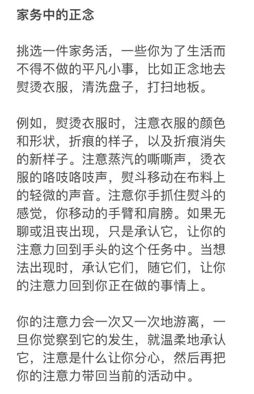 小组长解释道:这其实就是我们之前提到的“正念地做家务”,我们在设计完自己活动清单的时候,有三种方式能使我们更加关照和觉察自己的感受,以一种正念的方式过生活,让内在充满更多能量。