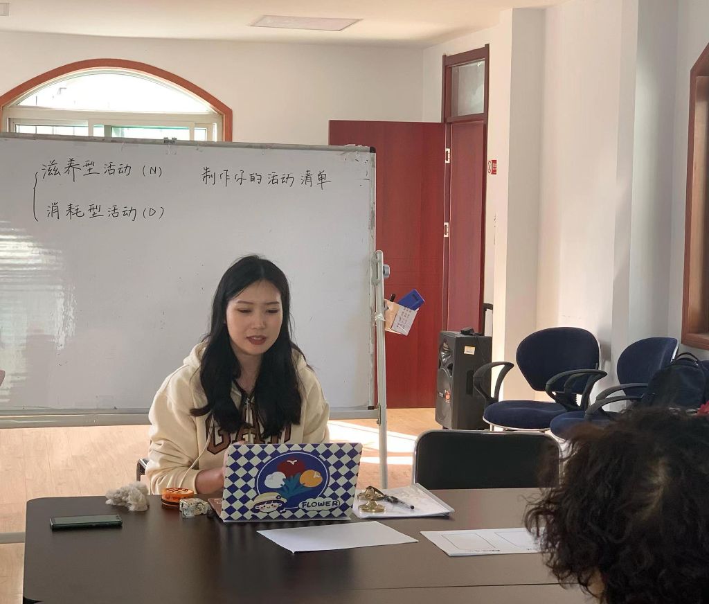 关于“滋养型活动”与“消耗型活动”,小组组长让大家的思考,在日常生活中,我们所做的事情之中,有哪些可以滋养我?有哪些能提振我的心情、让我充满活力、帮助我冷静和集中精神?有哪些会让我耗竭?有哪些会使我低落、榨干我的能量、致使我感到紧张和散乱?有哪些降低了我真正活着和临在当下的感觉?这其实就是“滋养型活动”和“消耗型活动”的区别。