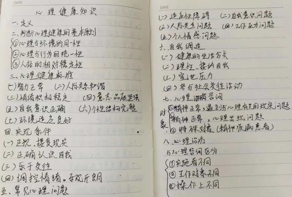 心理健康是指在身体、智能以及感情上与他人的心理健康不相矛盾的范围内,将个人的心境发展成最佳的状态。它的一些标志包括:(1)身体、智力、情绪十分协调;(2)适应环境,人际关系中彼此能谦让;(3)有幸福感;(4)在工作和职业中,能充分发挥能力,过着有效率的生活。判断心理健康的基本原则有(1)心理与环境的同一性。(2)心理与行为的统一性。(3)人格的相对稳定性。心理健康的标准:(1)智力正常。(2)人际关系和谐。(3)情绪积极稳定。(4)意志品质坚强。(5)自我意识正确。(6)个性结构完整。(7)环境适应良好。社工通过学习心理健康定义、基本原则、健康标准、实现条件、常见心理问题、自我调适、心理咨询、心理治疗8大板块重新梳理了心理健康方面的知识,增强了对心理健康知识的认知。