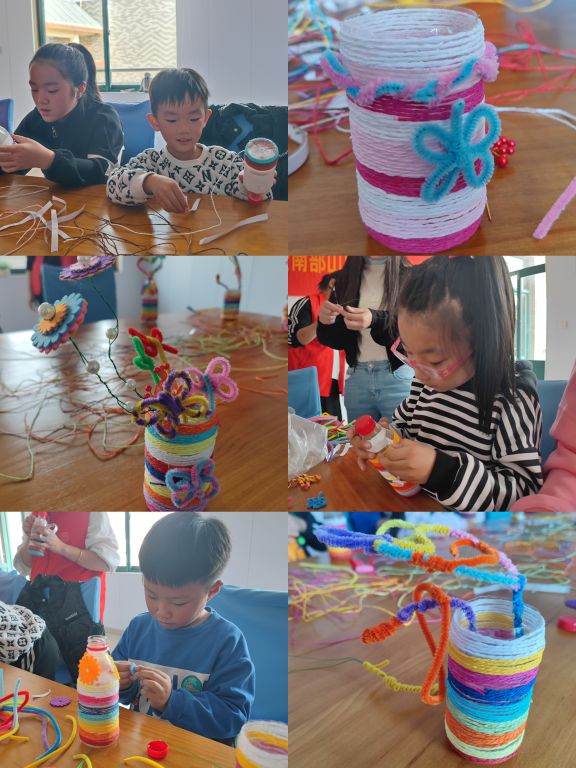 社工提前将塑料瓶清洗干净,完成双面胶缠绕工作。“小朋友们,我又来了,我是你们的……”,“小马老师”,“今天我们的主题是……”,“变废为宝……”,在争先恐后的互动下,今天的活动开始了,其次,社工为大家分发活动物料,在拿到物料后,全场瞬间安静了下来,大家聚精会神的制作属于自己的“花瓶”,大家将一根根五颜六色的手工编织纸绳缠绕在塑料瓶上,并将瓶身均匀、严密的绕好,不一会,塑料瓶“大变身”变成了一个个五颜六色、五彩缤纷的花瓶,“社工阿姨、叔叔,你看,我做的好看吗……”。成品完美的呈现出来后,大家开启了“比美”模式,现场情绪热烈,气氛高涨。