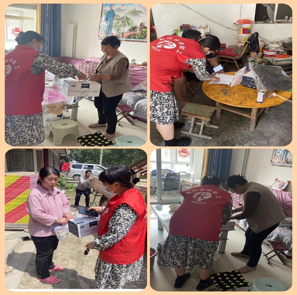 6.1上午,黄河街道社工站社工捧着一颗负责任的心、激情的心、爱的心来到工作岗位,根据前期的工作安排与部署,社工们逐步有序开展为辖区内孤困儿童送温暖活动,社工带着物资逐户走入每位儿童的家,亲自把温暖送到他们身边,并且对他们的近期状况和需求进行详细了解。“哎哟可真是辛苦你们了,每年都给我们孩子送来这些物品,真是非常感谢,孩子今天没在家,去上学了,下午这不是说要邀请我到学校去看他表演节目去呢!”“不客气大娘,这是我们应该做的,看到您和孩子都身体健康过得开心我们心里才会感到欣慰”。这是社工在走访时与一位儿童的奶奶的对话,看到儿童的家属表现出开心幸福的状态以及对我们社工工作的肯定,社工心里感到无比的欣慰和骄傲。